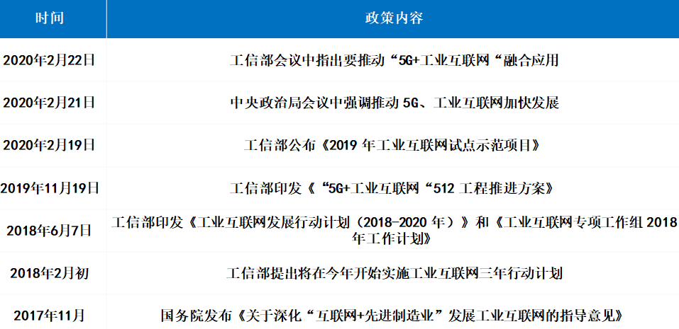 工业互联网是政策驱动型行业。首发的政策是在2017年7月发布的《关于深化“互联网+先进制造业”发展工业互联网的指导意见》。指导意见对工业互联网进行了定义,指出工业互联网通过系统构建网络、平台、安全三大功能体系,打造人、机、物全面互联的新型网络基础设施,形成智能化发展的新兴业态和应用模式。2018年5月,工信部发布《工业互联网发展行动计划(2018年-2020年)》,对行业发展进度提出了明确要求。按照政策要求,到2021年要初步建成工业互联网基础设施和产业体系。由此可见,2020年将是政策发力的一年。在政策的推动下,工业互联网行业有望进入快速增长的阶段。